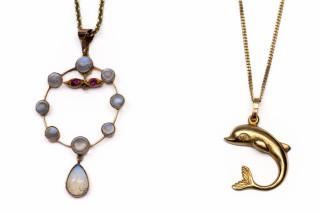 A below legal alloy gold pendant, in the shape of a wreath, set with moonstone and synthetic ruby. Hereby a 14 k. gold pendant in the shape of a dolphin and two necklaces