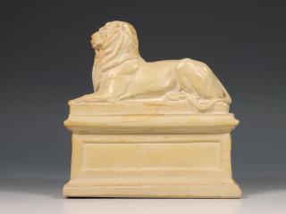 Gegoten hars vormstuk van leeuw op sokkel; miniatuur versie van New York Public Library sculpturen bij entree.