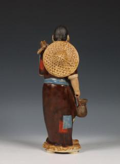 Japan, glazed earthenware figure of a man, 20th century, dressed in simple robes with a hat slung over his shoulder, the base signed (condition: some chips to his attributes)