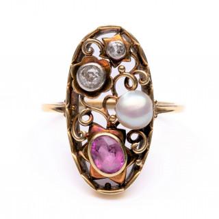 14 kt gold ring, with an oval top decorated with curls, a flower and stars. Set with a pink tourmaline, bouton pearl and two old brilliant cut diamonds (total approx. 0.20 ct.)
