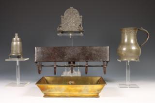 Antiek smeedijzeren wandrekje, tinnen maatkan, miniatuur haardplaat met Amsterdams stadswapen en tinnen sprenkelaar, 18e eeuw;