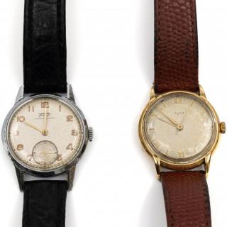 Altos, 18 k. gold mechanical men's wristwatch, on a brown leather strap. Hereby Tissot, base men's wristwatch on a black leather strap (movement defective).