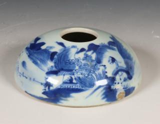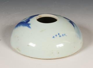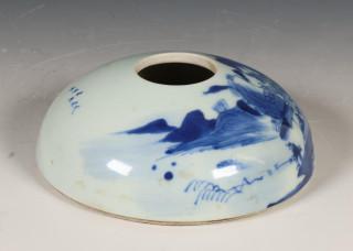 China, blue and white porcelain brush-washer, late Qing dynasty (1644-1912), the circular vessel decorated with figures in a river landscape, the base with apocryphal seal mark (condition: surface wear, chip of ca. 2 x 1 cm to the lower rim)