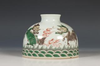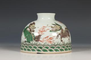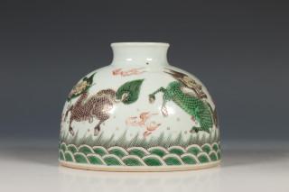 China, famille verte porcelain brush washer, 20th century, the rounded sides decorated with qilin, the base with apocryphal Kangxi mark (condition: chip of ca. 2.5 x 0.5 cm to the footrim)