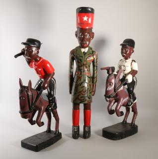 Drie decoratieve colon figuren; twee jockeys te paard en een militair.