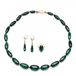 14 k. gold ring, a pair of earrings and a necklace. All with malachite