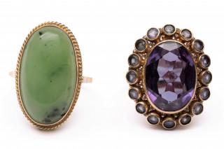 Two 14 k. gold rings, one set with an oval cabochon cut nephrite, the other with a synthetic corundum (imitation alexandrite) in a smoky quartz entourage