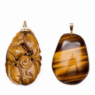 Two tiger eye pendants, one carved with a fruit motif, the other cabochon and can also be worn as a brooch. Both on a 14 k. gold mounting.