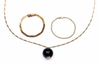 Drie 14 kt. gouden schakelarmbanden en één collier.