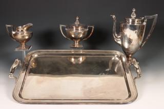 Bestaande uit koffiepot, melkkan, suikerpot en dienblad.