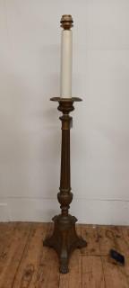 Koperen kandelaar met religieuze scenes op de voet, geëlektrificeerd. Compleet met groene kap.