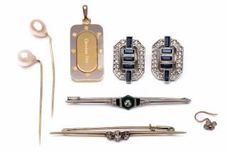Eén met roosdiamant, de ander in Art Deco stijl met onix (chips), groene agaat en diamant. Hierbij diverse gouden en onedele sieraden waaronder een hanger van Christian Dior