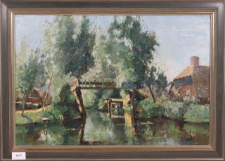 Zonnig gezicht op een bruggetje bij boerderijen