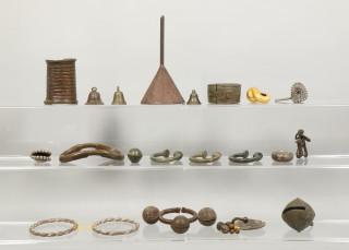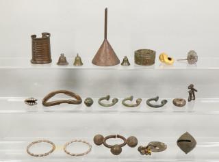 O.a. Ghana, drie Portugese manilas, een scharnierde armband, marktkoopvrouwen-bel en een koningsring met goudverf. Sri Lanka, teenring en India zilverkleurig ringetje.