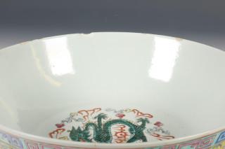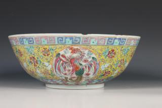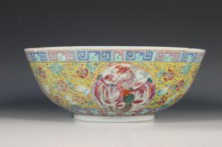 China, famille rose geelgegronde porseleinen 'feniks' kom, 20e eeuw,