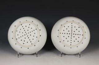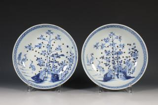 de ronde openwerkte schalen op ronde onderschotels, alle beschilderd met kraanvogels, bamboe en pijnbomen (chipje, haarlijnen)
