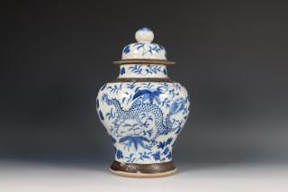 China, blue and white porcelain jar and cover, early 20th century, decorated with dragons and peonies, with apocryphal Qianlong four-character mark