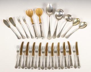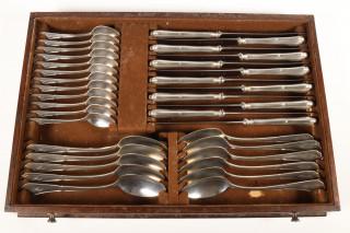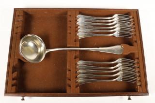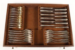 gecontourneerd steeluit einde met lettermonogram, delen verguld, bestaande uit: twaalf dinercouverts, twaalf dessert vorken, veertien koffielepels en elf theelepels, twaalf grote- en twaalf kleine messen, twaalf vruchtenmesjes en tien vorken, soepopdienlepel, aardappel, groentelepel, slacouvert, sauslepel, paar compotelepels, paar botermesjes, paar vleesvorken, twee messen met monogram. In donker gekleurd eikenhouten kist met drie lades en klep, grepen en slot(sleutel ontbreekt), mt. Bremen Silberwarenfabrik Bremen 1905-1981, 800st, 3e gehalte