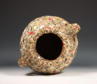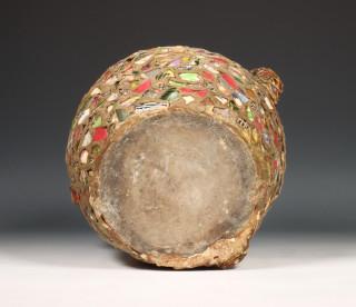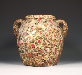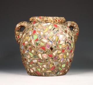 Stenen kruik belegd met porseleinen en aardewerk scherven.