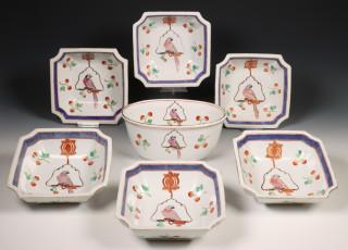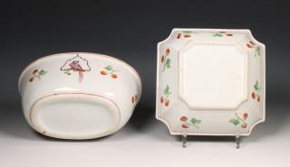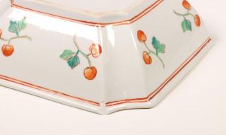 Uitgevoerd met decor van papegaaien en kersen. Hierbij ovale kom met eenzelfde decor.