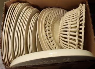 Waaronder diner- en ontbijtborden en twee gevlochten schaalmanden (beschadigingen).