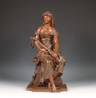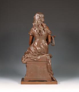 Bruin gepatineerd metalen sculptuur van gezeten vrouw met lier, gesigneerd Hip Moreau, ca. 1900.