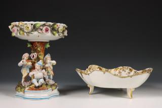 UItgevoerd met figuren met semi muziekinstrumenten. (beschadigd). Hierbij een porseleinen schaal op drie pootjes gedecoreerd met bloemen, gemerkt met pseudo merk Ludwigsburg.