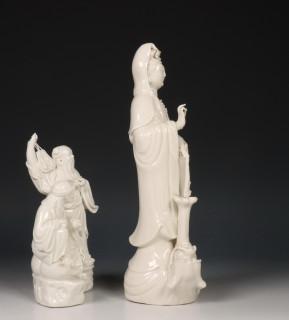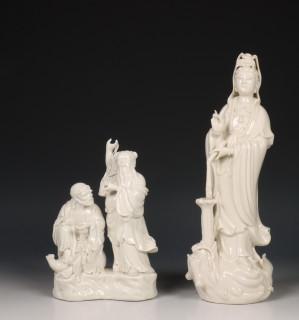 China, two blanc-de-chine figural groups, early 20th century, one standing Guanyin and one of two Immortals (condition: both groups with small chips to protruberances)