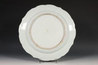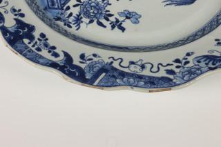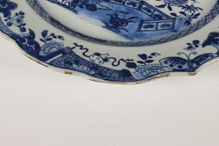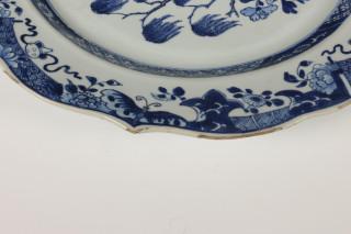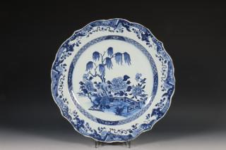 China, blue and white porcelain dish, Qianlong period (1735-1796), with sculpted border, decorated with chrysanthemum and willow in a fenced garden (condition: fritted rim, some chips)