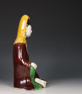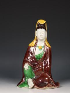 China, sancai-glazed figure of Guanyin, late 18th/ 19th century, in seated position and dressed in draped robes (condition: chip to hand)