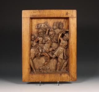 Eikenhouten gestoken kastpaneel, 18e eeuw;Uitgevoerd met voorstelling van Ridders.