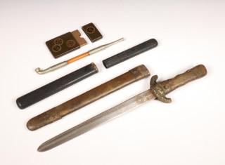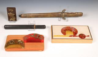 bestaande uit drie kammen, een haarklem, een visitekaartjeshouder, een mes en een opiumpijp