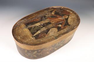 UItgevoerd met geschilderde voorstelling van figuur en bloemen rondom.
