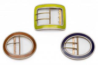 France, a silver gilded rectangular belt buckle, The front decorated with light green guilloche and white enamel. Hereby two base oval belt buckles, one with purple and white enamel and one with brown and white enamel (one tooth is missing).