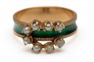 France, 18 k. gold ring, ca 1900. The front with a horseshoe, set with seed pearls, the middle part of the ring decorated with dark green enamel (two pearls damaged)