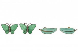 Volmer Bahner, een paar oorclips in de vorm van vlinders en E. Dragsted, een paar oorclips in de vorm van veren. Beide met lichtgroen guilloche email (één vlinder licht beschadigd)