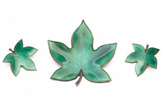 Brodrene Bjorklund, Denmark, silver brooch with matching ear clips. In the shape of a maple leaf, all with dark green guilloche enamel. The pin base