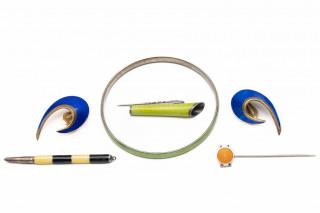 Norway, a pair of silver ear clips. In the shape of a curl, decorated with blue guilloche enamel, the back is gilded. Herbey a rigid bracelet and corsage brooch with light green enamel, a lapel pin with the colors of the Dutch flag and pennant and a pencil with yellow and black enamel