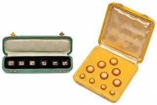A set of celluloid buttons in a case, 1940s. Amber coloured, the middle with cat's eye (chatoyancy) effect. Hereby six squares of goldstone, each with four enamelled diamond shapes, in a case.