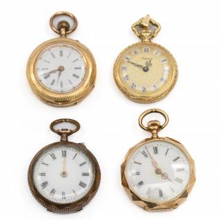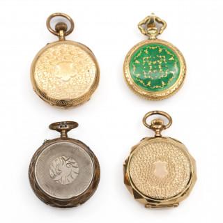 Eén op de achterzijde gedecoreerd met groen guilloche email, zonder binnendeksel. Twee met onedele binnendeksel. Hierbij een zilveren remontoir horloge