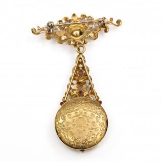 Rondine, 18 kt gold fob watch. The gold-coloured dial with synthetic rubies instead of numerals. The triangular top and the navette-shaped brooch with a motif of curls and set with ruby and pearls. mt. J.G.W. Estéjé, Amsterdam, va. 1966