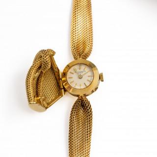 Baume & Mercier, 18 k. gold mechanical ladies cocktail watch, 1950s. The Milanese strap in the shape of a bow. The middle part can be flipped open to reveal the dial