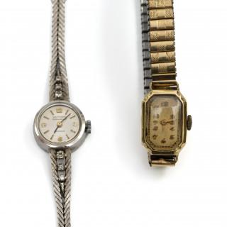 Victoria International, 14 k. white gold mechanical ladies wristwatch. On a herringbone link strap, with brilliant cut diamonds. Hereby a mechanical ladies wristwatch (defective) with a 14 kt. gold case, on a double stretch strap
