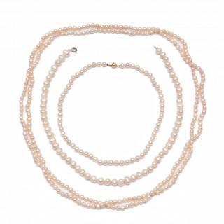 Three pearl necklaces. Two cultured and one freshwater. One with a gold clasp