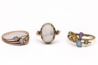 Eén bezet met twee diamanten en één imitatie. De andere met citrien, topaas, amethyst en peridoot. Hierbij een 14 kt. gouden ring met maansteen