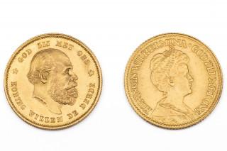 Two golden ten guilder coins, Willem I, 1876 and Wilhelmina, 1911