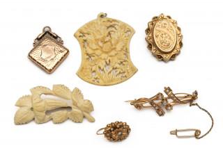 Hierbij diverse antieke sieraden waaronder twee van gesneden been (oorbel enkel, bij één broche mist de speld)