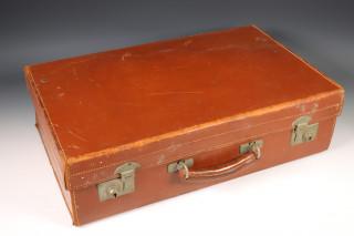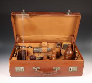 Reis nécessaire in bruin leren koffer, ca. 1920;