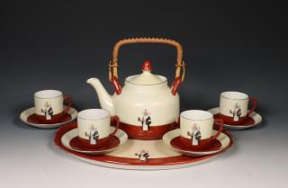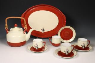 bestaande uit: theepot, vier kop en schotels en dienblad