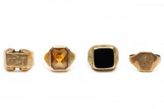 Four 14 k. gold vintage signet rings. Two engraved with monogram, one with onix and one with an orange synthetic corundum